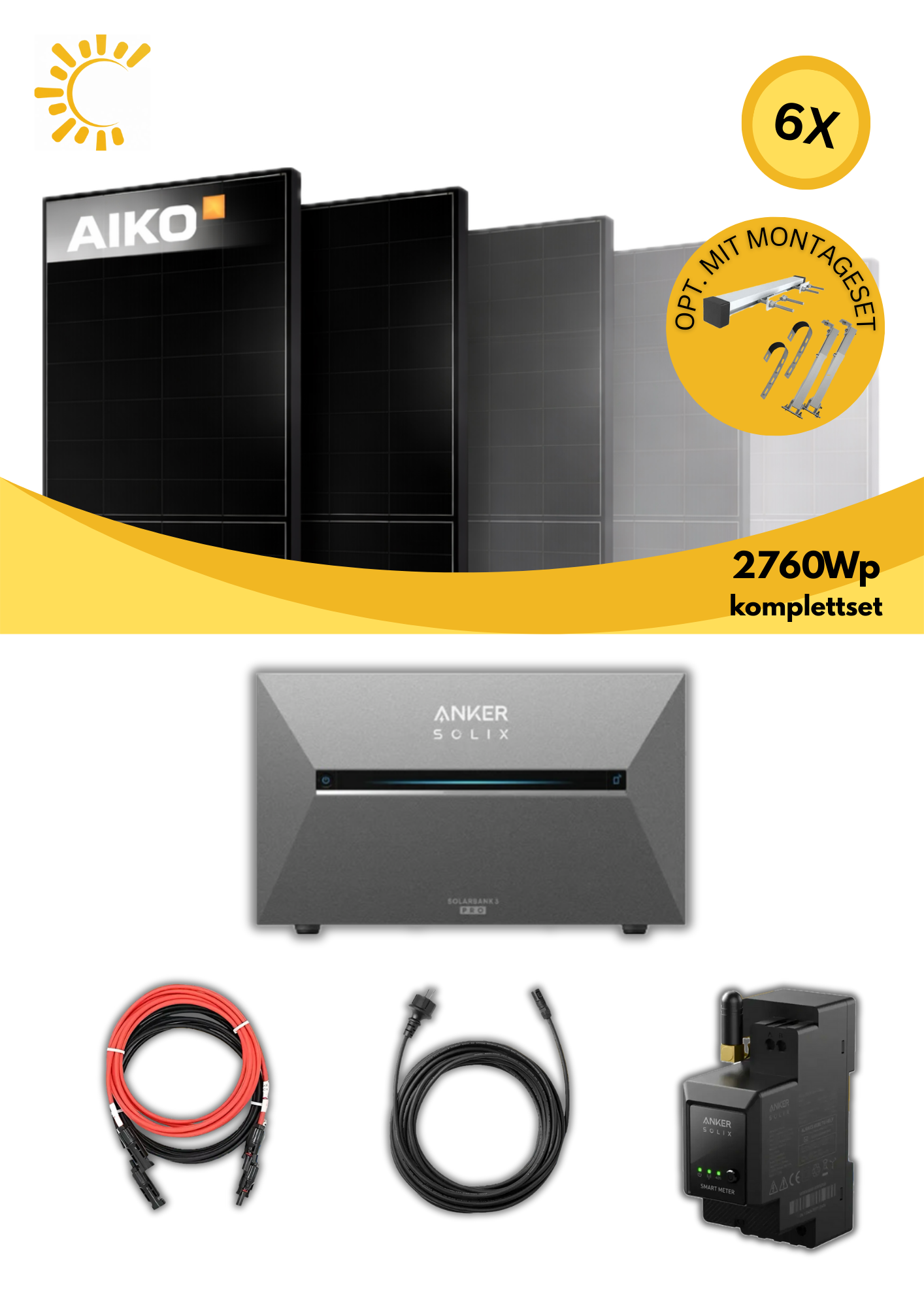 Dieses Set kombiniert sechs leistungsstarke Aiko 460 W Module mit der Anker Solix Solarbank 3 Pro und einem Smart Meter, um eine flexible und effiziente Lösung für den Eigenverbrauch zu bieten. Mit der Anker Solix Solarbank 3 Pro (E2700 Pro) und einem Smart Meter – für maximale Unabhängigkeit, Eigenverbrauchsoptimierung und einfache Steuerung per App. Ideal für alle, die Solarstrom nicht nur erzeugen, sondern auch intelligent speichern und nutzen möchten.