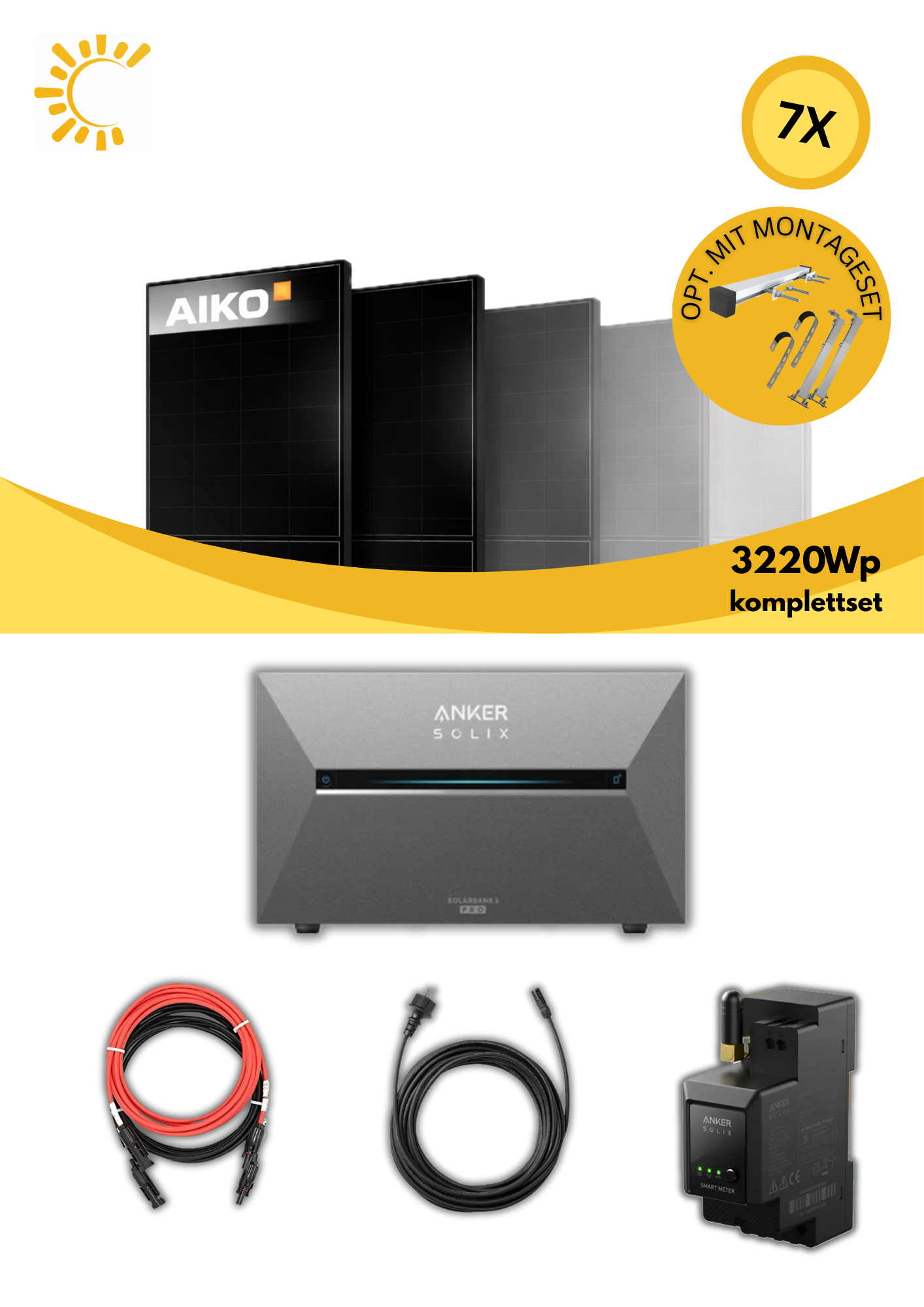 Dieses Set kombiniert sieben leistungsstarke Aiko 460 W Module mit der Anker Solix Solarbank 3 Pro und einem Smart Meter, um eine flexible und effiziente Lösung für den Eigenverbrauch zu bieten. Mit der Anker Solix Solarbank 3 Pro (E2700 Pro) und einem Smart Meter – für maximale Unabhängigkeit, Eigenverbrauchsoptimierung und einfache Steuerung per App. Ideal für alle, die Solarstrom nicht nur erzeugen, sondern auch intelligent speichern und nutzen möchten