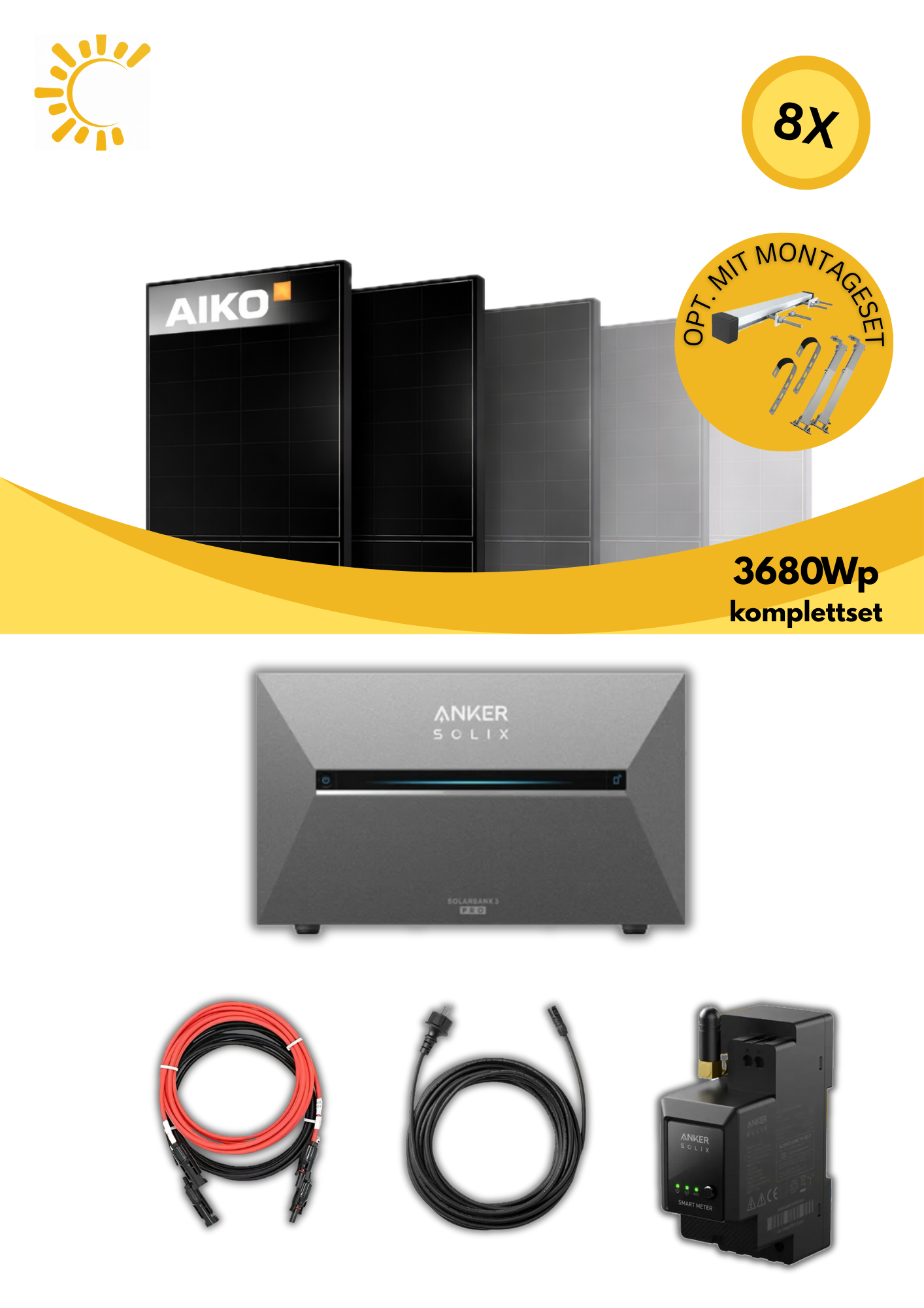 Dieses Set kombiniert acht leistungsstarke Aiko 460 W Module mit der Anker Solix Solarbank 2 Pro und einem Smart Meter, um eine flexible und effiziente Lösung für den Eigenverbrauch zu bieten. Mit der Anker Solix Solarbank 3 Pro (E2700 Pro) und einem Smart Meter – für maximale Unabhängigkeit, Eigenverbrauchsoptimierung und einfache Steuerung per App. Ideal für alle, die Solarstrom nicht nur erzeugen, sondern auch intelligent speichern und nutzen möchten.