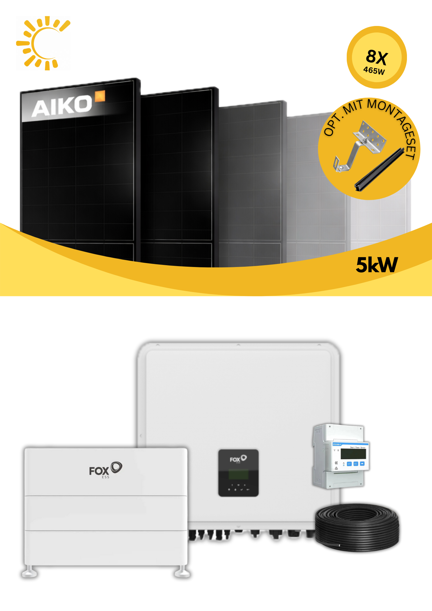 Das dargestellte Komplettpaket besteht aus 8 leistungsstarken Aiko Neostar 2S+ Full Black Solarmodulen mit jeweils 465 W. In Kombination mit dem FoxESS-Wechselrichter, dem dazugehörigen FoxESS-Batteriespeicher, einem passenden Smart Meter sowie einem optional wählbaren Montageset bietet das System eine effiziente, leistungsstarke und skalierbare Lösung zur Eigenstromversorgung.