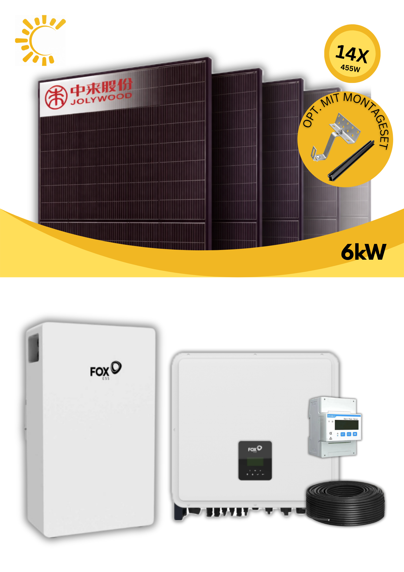 Das dargestellte Komplettpaket besteht aus 14 leistungsstarken Jolywood Solarmodulen mit jeweils 455 W. In Kombination mit dem FoxESS-Wechselrichter, dem dazugehörigen FoxESS-Batteriespeicher, dem passenden Smart Meter sowie einem optionalen Montageset bietet das System eine effiziente und skalierbare Lösung zur Eigenstromversorgung.