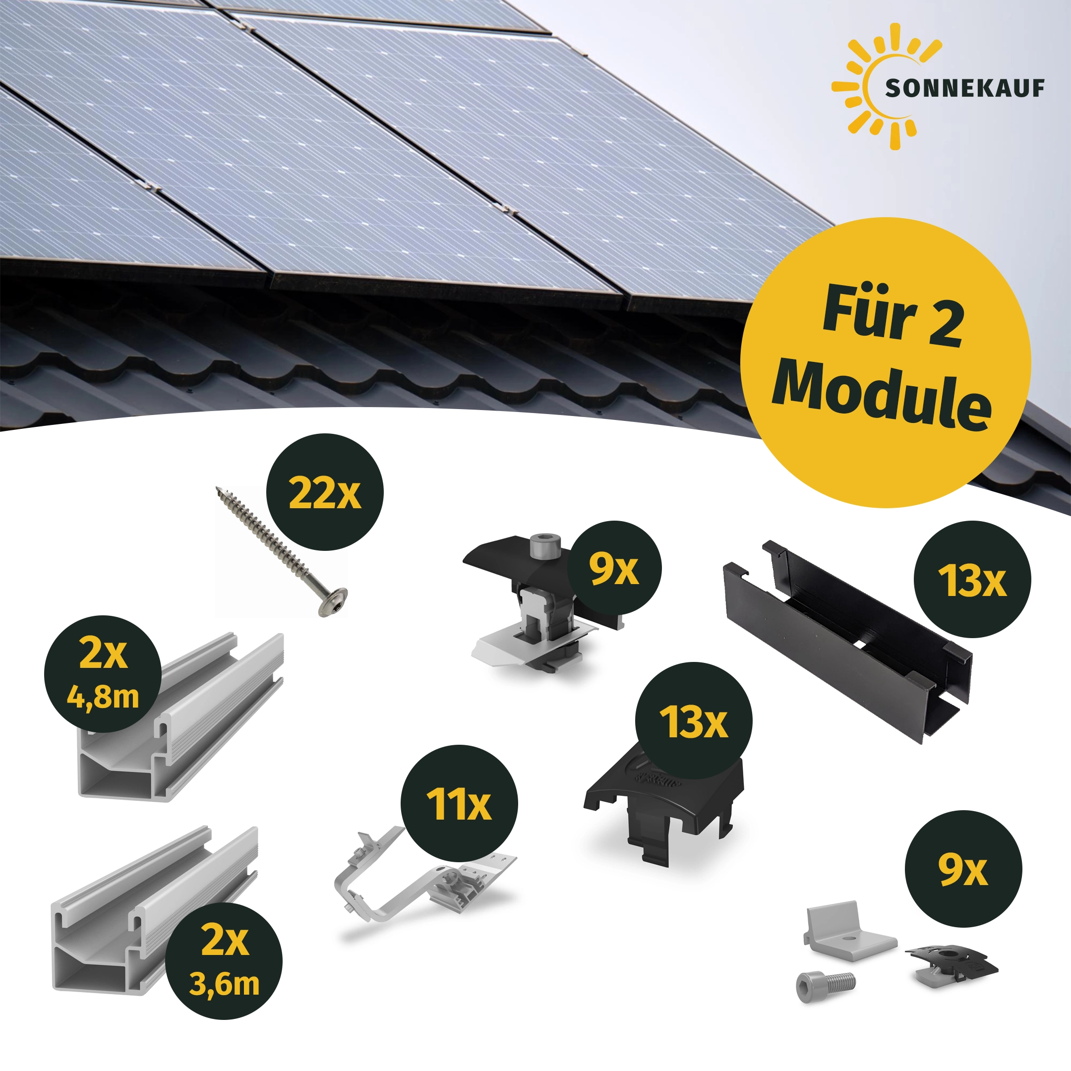 Speziell für anspruchsvolle Dachgeometrien und Ziegel- oder Pfanneneindeckungen konzipiert, garantiert das Set durch die Verwindungssteifigkeit der Kreuzverbindung eine langlebige und sichere Installation. Das System besteht aus hochwertigen Aluminiumprofilen und Edelstahlkomponenten für höchste Witterungsbeständigkeit.