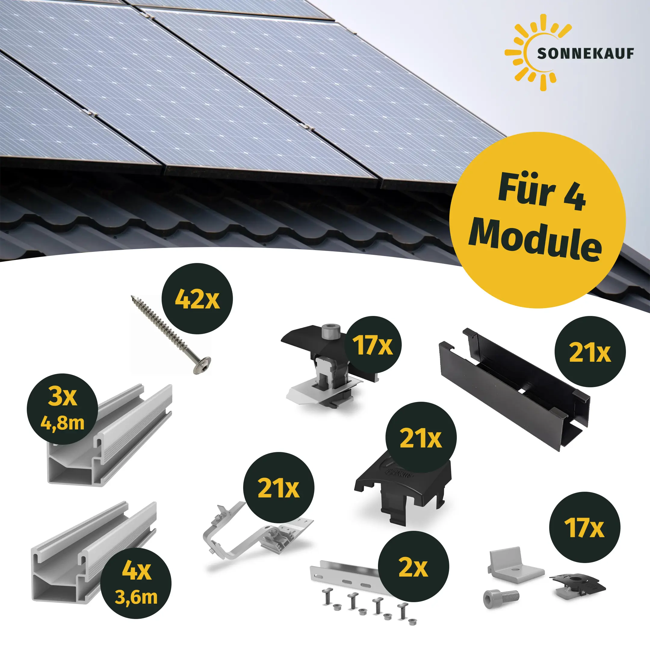 Speziell für anspruchsvolle Dachgeometrien und Ziegel- oder Pfanneneindeckungen konzipiert, garantiert das Set durch die Verwindungssteifigkeit der Kreuzverbindung eine langlebige und sichere Installation. Das System besteht aus hochwertigen Aluminiumprofilen und Edelstahlkomponenten für höchste Witterungsbeständigkeit.