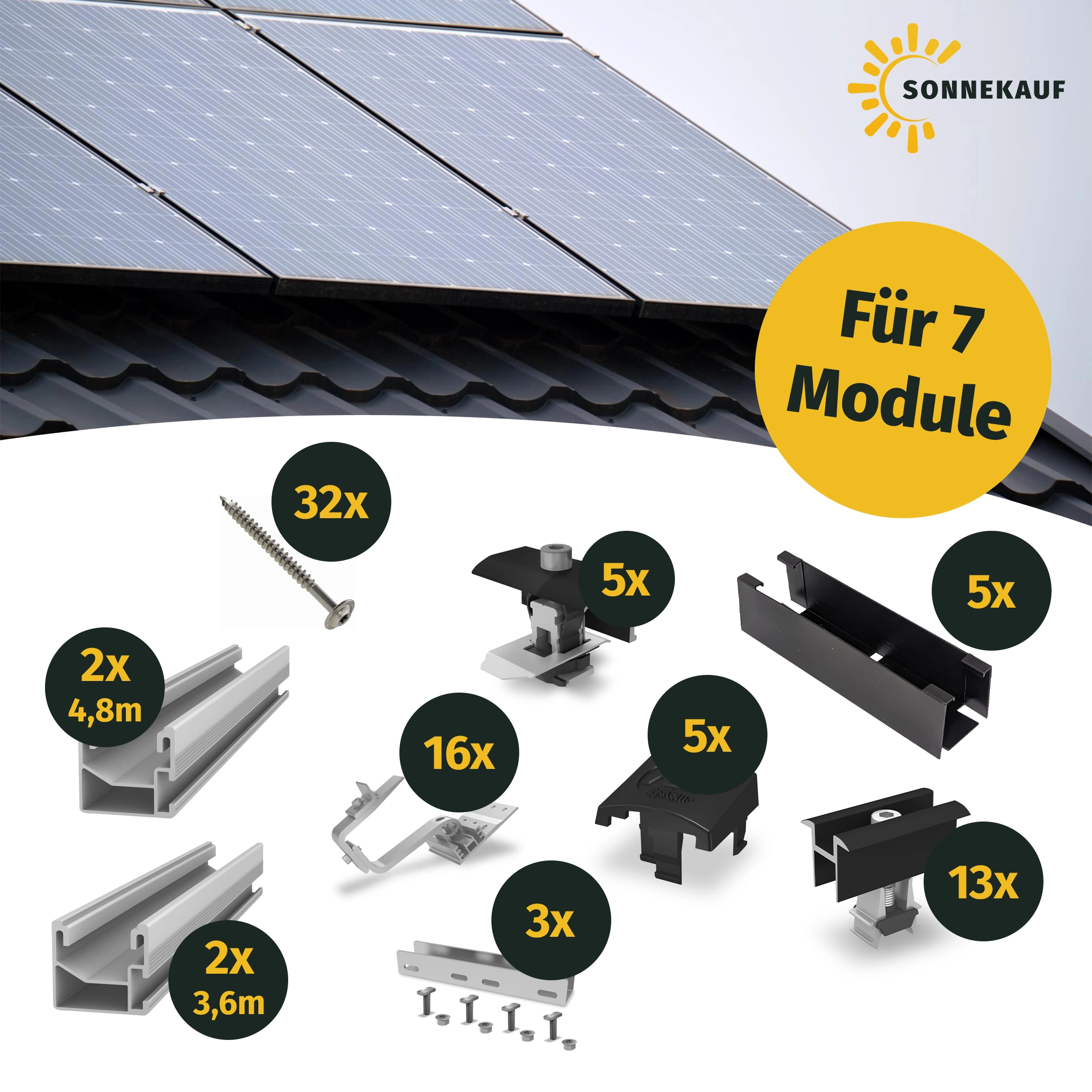 Hinweis: Jedes Dach muss vorab statisch geprüft werden! Zusätzliche Komponenten sind bei abweichenden Dachbeschaffenheiten und höheren Windlastzonen erforderlich.