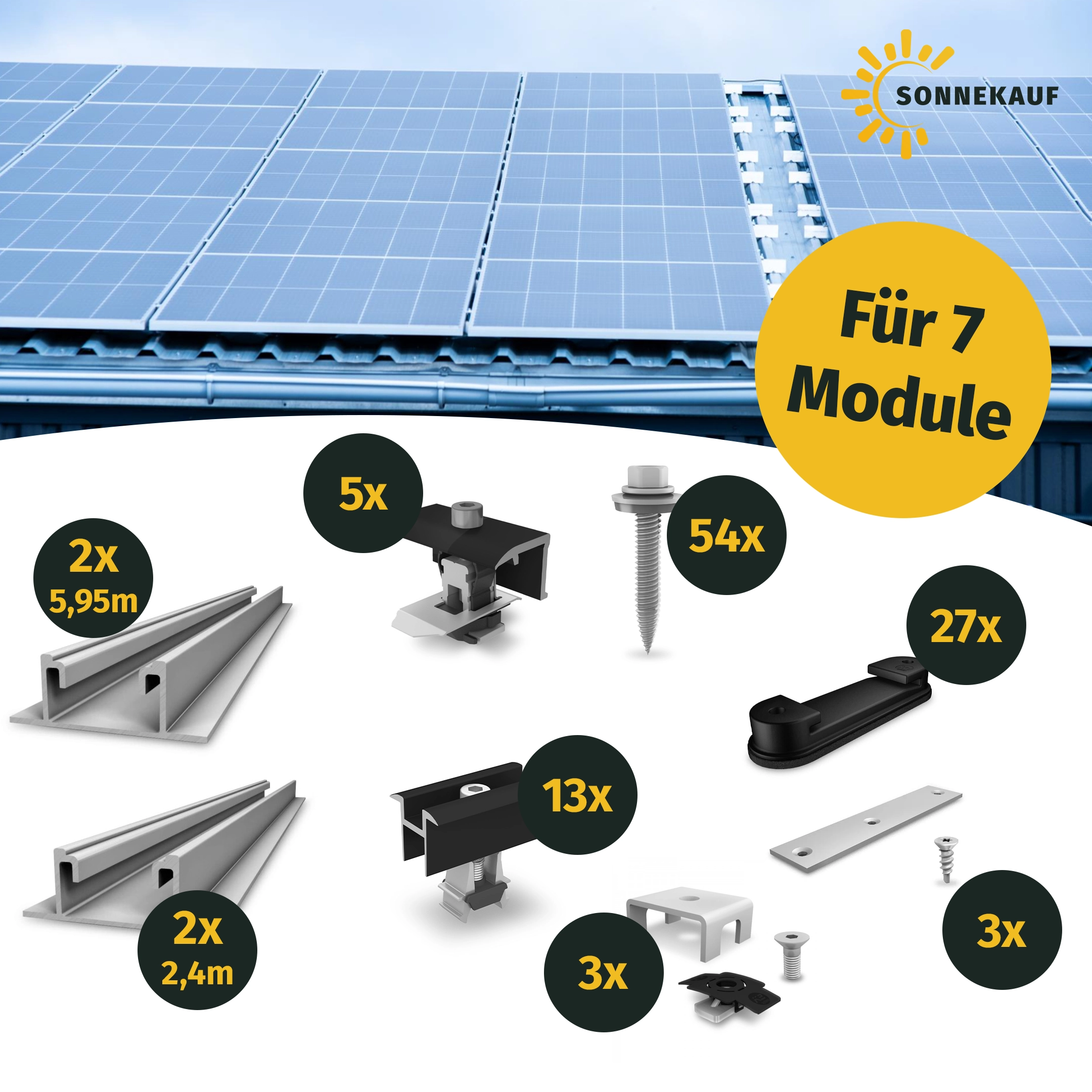 Hinweis: Das System ist für gängige Trapezbleche ab einer Stärke von 0,4 mm (Stahl) bzw. 0,5 mm (Alu) geeignet. Die Montage-Sets basieren auf der Windlastzone 2 und einer Modulbreite von 1134 mm. Jedes Dach muss vorab statisch geprüft werden!
