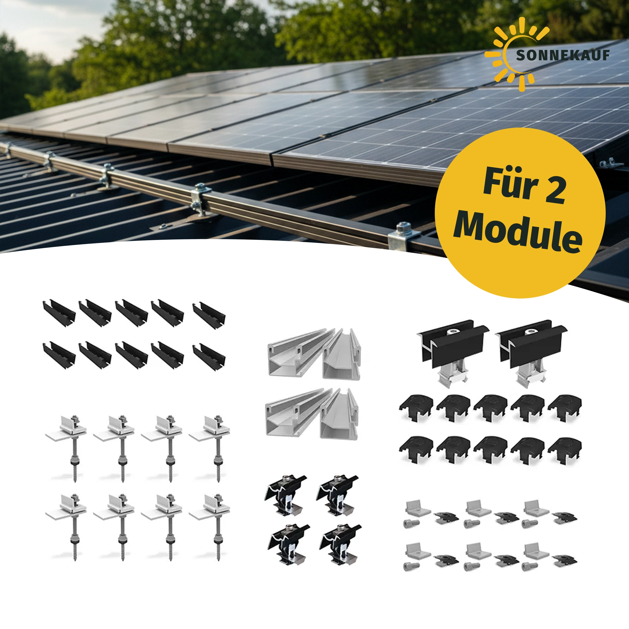 Kombiniert mit stabilen Aluminium-Trägerprofilen und schwarzen Modulklemmen bietet dieses Set eine langlebige, sichere und optisch ansprechende Montage für Ihre Photovoltaikanlage.