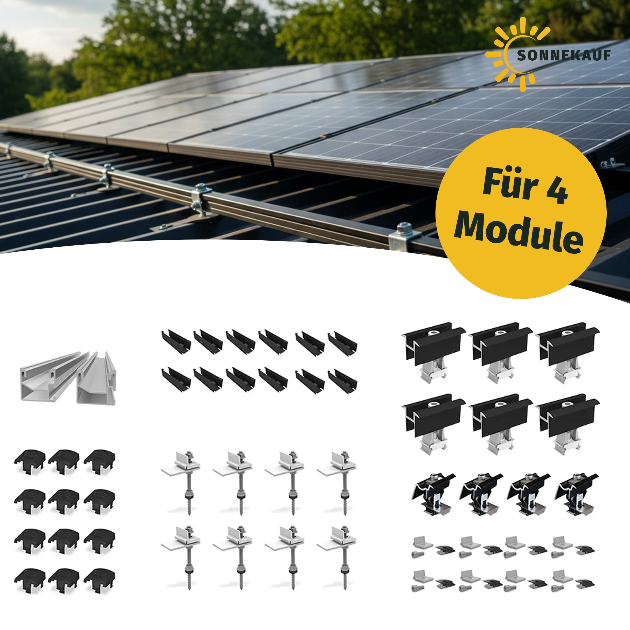 Kombiniert mit stabilen Aluminium-Trägerprofilen und schwarzen Modulklemmen bietet dieses Set eine langlebige, sichere und optisch ansprechende Montage für Ihre Photovoltaikanlage.